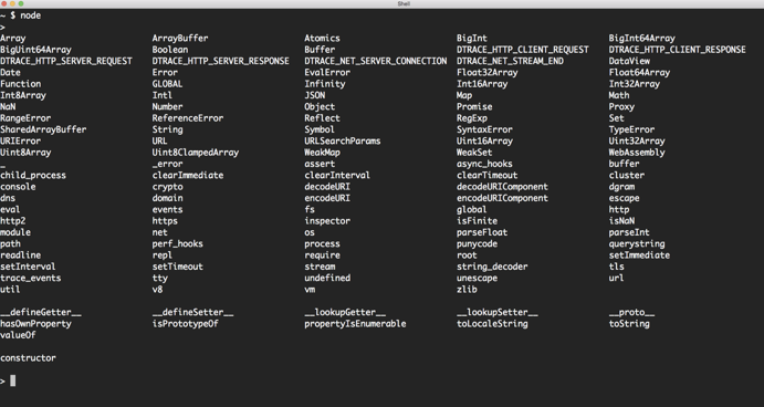 This discoverability also works on the global level itself. If you double TAB on an empty line, everything that is globally available in Node appears. This is a big list, but it’s a useful one:
